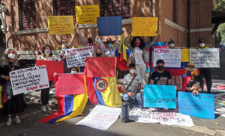 I manifestanti, che si sono presentati davanti l’ambasciata con cartelloni e bandiere colombiane, hanno anche letto i nomi di 43 persone che secondo la ONG colombiana Temblores “sono rimaste uccise da presunti membri delle forze dell’ordine”. In un colloquio con l’agenzia Dire, dopo la manifestazione, Rodriguez ha sottolineato che un altro tema denunciato dai manifestanti “è stato quello delle 500 persone scomparse in neanche un mese di cortei”.