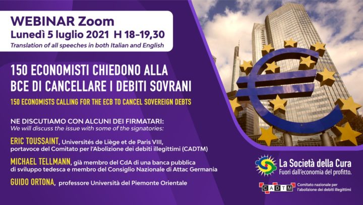 Questo Webinar è organizzato da “La Società della Cura” e CADTM Italia come momento di autoeducazione popolare. E’ necessario diffondere consapevolezza sui temi dell’appello i cui obiettivi devono essere condivisi, come proposto da “La società della Cura”, da un ampio schieramento di movimenti sociali.