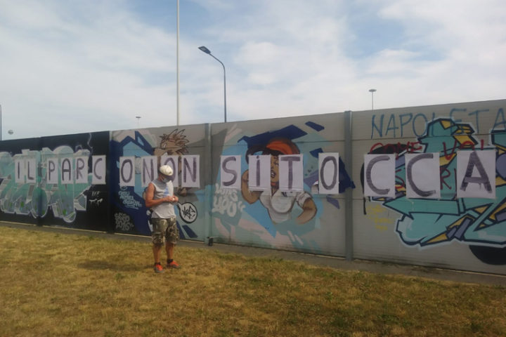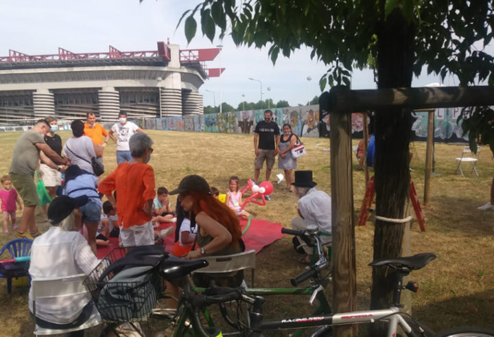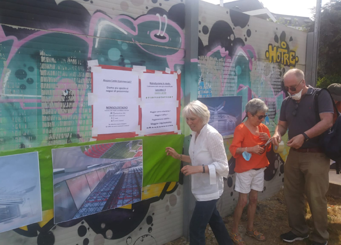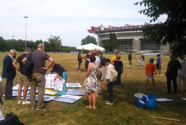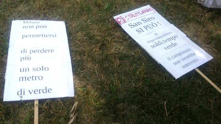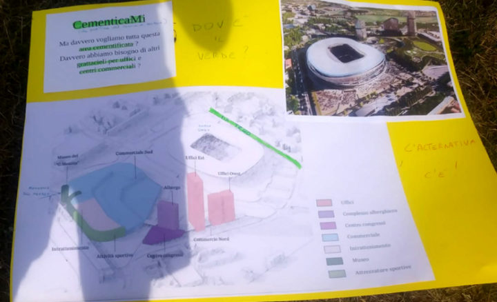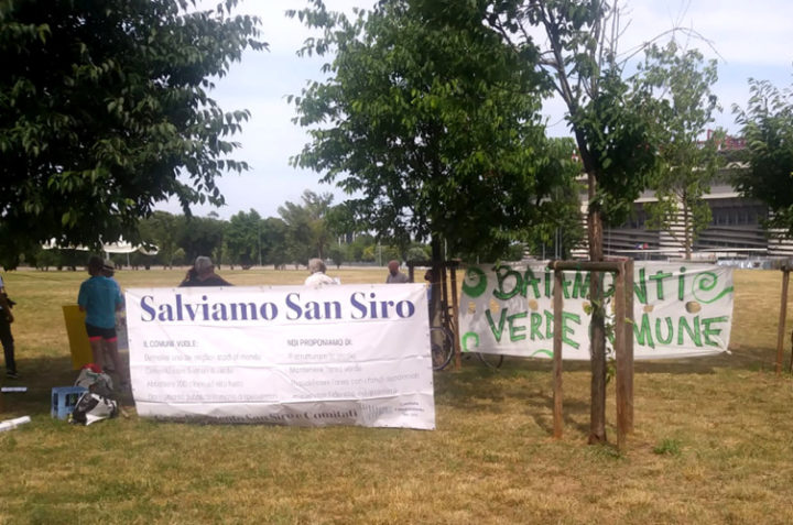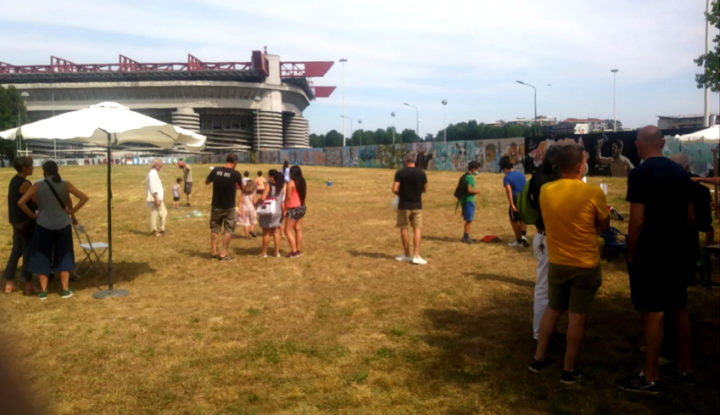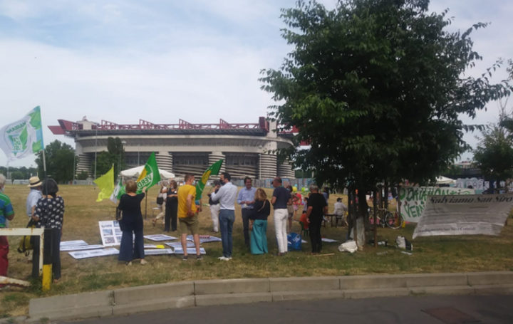 Non si può dire che al coordinamento San Siro manchi del coraggio: domenica 27 Giugno alle 15,30 convoca un presidio nel parco adiacente allo stadio. Il quartiere sembra un deserto, un caldo impressionante, ma quell’angolo si anima di colpo: gazebo, giochi per i bimbi, striscioni, bandiere, e poi cartelli, foto, progetti che documentano i rischi per la zona e il progetto che loro sostengono.