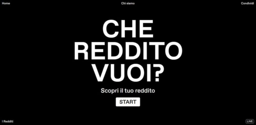 – offrire ai partecipanti quale specifica declinazione (di base, universale, minimo garantito ecc.) rispondesse ai loro bisogni e alle loro visioni. Dunque a seconda delle risposte fornite alle domande proposte, la fine del questionario avrebbe portato a un risultato in cui si sarebbe svelata la risposta centrale a «che reddito vuoi»;