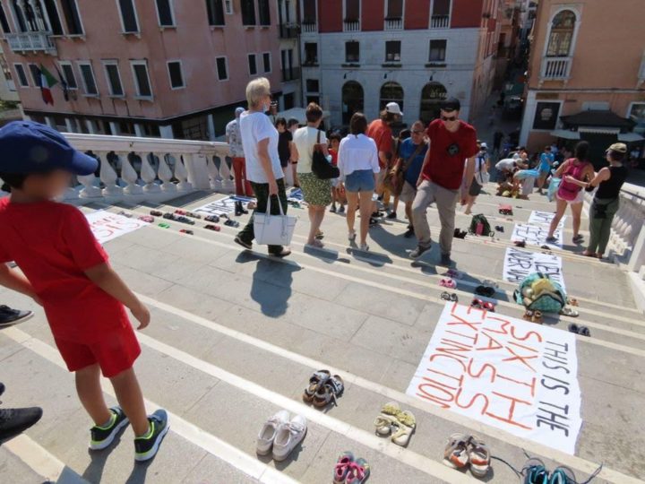 Appuntamento alle 10.30 al Ponte degli Scalzi, per un flash mob con oltre 400 paia di scarpe da bambini, raccolte grazie alla generosità di numerosi genitori, disposte sugli scalini del Ponte (lasciando libero il passaggio pedonale) con l’interrogativo di quale futuro stiamo lasciando ai nostri figli. Nel frattempo, di fronte alla stazione di Venezia S. Lucia uno spazio sicuro per persone, famiglie, attivist* permette di esprimersi con interventi e letture al microfono. Questa installazione dà il via all’ultima giornata di mobilitazione di Extinction Rebellion in protesta al G20.