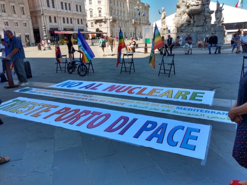 Con l’obiettivo di convergere nel Coordinamento per la pace e i diritti Danilo Dolci, domenica 5 settembre alle ore 11.00 in piazza Unità a Trieste si è tenuta una manifestazione sul Progetto presentato alle Nazioni Unite, di de-nuclearizzazione dei Porti di Trieste e Capodistria, in collegamento con la manifestazione degli antinucleari tedeschi alla base di Büchel. Sullo sfondo diverse bandiere della pace bilingui e alcuni striscioni colorati con le tinte dell’arcobaleno con le scritte “Mediterraneo Mar de Paz”, “No al nucleare” e “Trieste porto di pace”. L’iniziativa si è aperta con un saluto in italiano e sloveno.