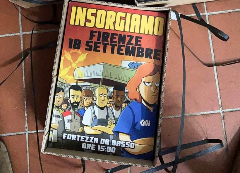 Continua la mobilitazione dei lavoratori licenziati dalla multinazionale GKN immediatamente dopo lo “sblocco” del governo concertato con le parti sociali sindacali e datoriali– Sabato 18 settembre, Fortezza da Basso (h.15:00). Pubblichiamo integralmente il manifesto di convocazione con l’immagine del volantino disegnata da Zerocalcare