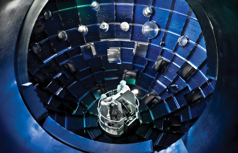 Nel campo del confinamento inerziale la NIF di Livermore in California non ha rivali al mondo per dimensioni e caratteristiche: ospitata in un edificio di quasi 2 ettari di superficie e alto 10 piani, utilizza una varietà di banchi ottici, fibre ottiche e specchi per generare, amplificare e manipolare un impulso laser in modo da fargli assumere il profilo temporale voluto, fino a una durata massima di 30 ns: l’energia massima del fascio raggiunge i 4,8 MJ per impulsi infrarossi e 1,9 MJ per impulsi ultravioletti; l’impulso viene suddiviso fino a 192 fascetti che vengono inviati simultaneamente sul bersaglio in una camera di diffusione del diametro di 10 m dotata di una panoplia di sistemi di misura e di apparati diagnostici. La suddivisione in fascetti serve sia per diminuire il carico di potenza sul sistema ottico che per creare uno spot sul bersaglio della dimensione spaziale voluta.