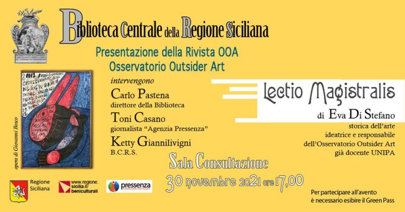 Palermo, martedì ultimo del mese, alle ore 17.00 nella “Sala Consultazione” della BCRS-Biblioteca Centrale della Regione Siciliana sarà presentata, a cura di Ketty Giannilivigni, la Rivista OOA-Osservatorio Outsider Art, ideata dalla storica dell’arte Eva Di Stefano che interverrà con una lectio magistralis sul tema: “Art Brut, Outsider Art, Arte Contemporanea”.