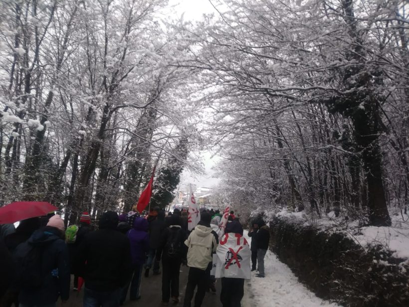 L’appuntamento è alle 13 a Borgone, uno dei paesi della bassa valle, uno dei tanti luoghi che in molti abbiamo imparato a conoscere in quella cartina dove si incrociano e si scavalcano autostrada, statale, ferrovia. Come spesso accade a queste manifestazioni all’inizio sembra di essere in pochi, nevica, freddo da sopra e da sotto, ma cominciano i primi abbracci, ci si ritrova. Gli arrivi da lontano scaldano i cuori dei valsusini, tutti impegnati nell’organizzazione: il camion, il ristoro, i gonfaloni che non passano nel sottopassaggio. Dopo un po’ il corteo si distende e nel giro di poco è lungo almeno 500 metri, moltissimi i giovani. In una natura ovattata dalla neve, tra le ultime case e il bosco, si alternano discorsi, musica, i ritmi dei tamburi della Murga coloratissima arrivata da Milano. Tra i primi striscioni quello degli amministratori della valle, almeno una decina di fasce tricolori, uomini e donne che non hanno alcun problema a mescolarsi col loro popolo. Molti i ricordi di Emilio, da pochi giorni detenuto in Francia.