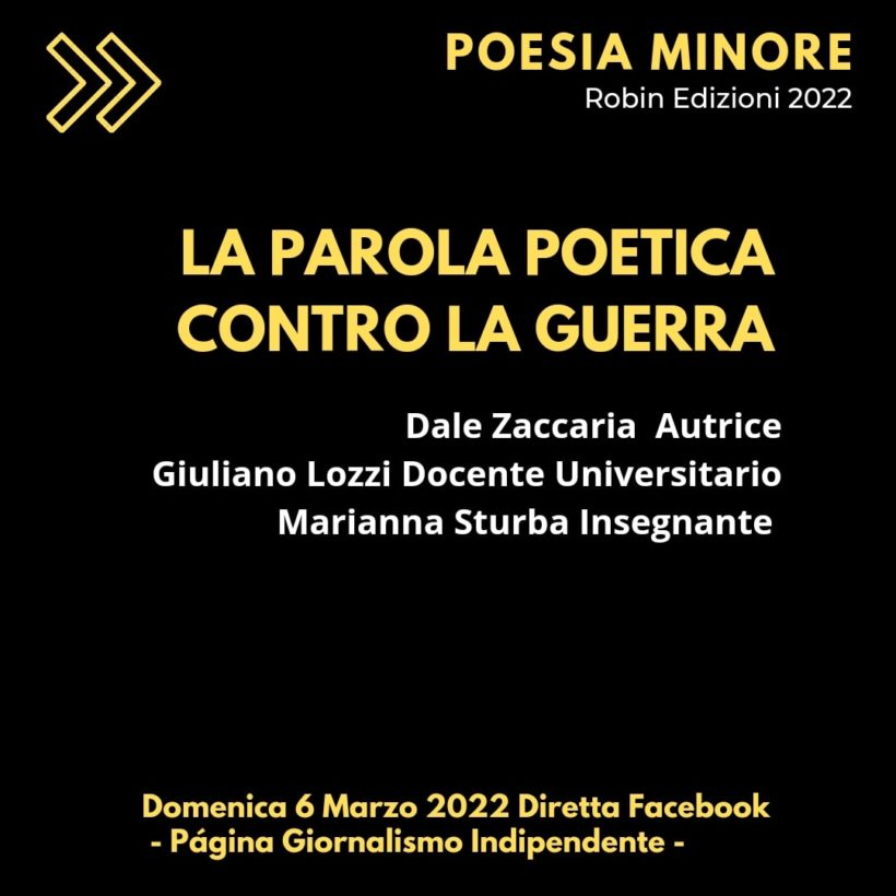 Invitiamo tutte e tutti a partecipare alla diretta facebook che si terrà domenica 6 Marzo alle 18,00 sulla pagina facebook di Giornalismo Indipendente, per confrontarci e discutere insieme su questo momento storico difficile e preoccupante, su come la parola poetica e la Poesia siano importanti per contrapporci “all’ideologia della morte che sempre più si diffonde: la voluttà di uccidere e di farsi uccidere con un’infinità di strumenti e di occasioni.” affermava il Critico Giorgio Barberi Squarotti.