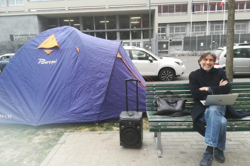 L’ho finalmente potuto incontrare di recente, proprio davanti alla tenda che ha piantato di fronte al Liceo Scientifico Statale Albert Einstein di Milano nel quale insegna, per capire quali siano le ragioni che hanno portato questo distinto professore a portare avanti tali iniziative.