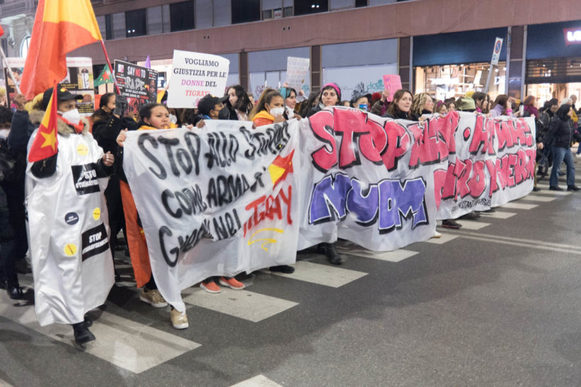 Un camion bianco apre la strada, musica, rivendicazioni, gli interventi si susseguono. No alla guerra in Ucraina e vicinanza ai civili vittime della stessa. Lo smantellamento della sanità pubblica, le malattie femminili non riconosciute come la vulvodinia. La richiesta di giustizia da parte di una rappresentanza delle donne del Tigray, contro gli stupri e le violenze sessuali subite durante la guerra in corso. Centinaia sono state sottoposte a trattamenti brutali allo scopo di degradarle e privarle della loro umanità, come ha denunciato un rapporto di Amnesty International l’11 agosto del 2021.