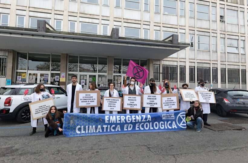 L’iniziativa di oggi si inserisce all’interno di una giornata di mobilitazione internazionale, in cui centinaia di scienziati in tutto il mondo hanno scelto di entrare in azione con diverse forme di disobbedienza civile. Questa mattina, infatti, altre azioni si sono registrate alla Raffineria ENI di Porto Marghera, all’Università La Sapienza di Roma e in tante altre parti del mondo. Scientists Rebellion è una community di scienziati nata dentro Extinction Rebellion, con lo scopo di sottolineare come sia ormai necessario e non più procrastinabile ascoltare la scienza e come sia un dovere degli scienziati prendere posizione. Come si legge sul sito di Scientists Rebellion, infatti: “Se nemmeno noi scienziati abbiamo un comportamento coerente con questa situazione di emergenza, come possiamo pretendere che lo faccia la gente?” [3]. Pochi mesi fa, a Glasgow, il gruppo ha fatto parlare di sé organizzando diverse azioni in occasione della COP26, le quali si sono concluse con l’arresto di 21 scienziati e hanno spinto la prestigiosa rivista scientifica Nature a prendere posizione in un raro editoriale [4]. A Torino, il 17 febbraio, tre dottorandi erano già entrati in azione presso gli uffici dell’Assessorato all’Ambiente in Via Principe Amedeo [5].
