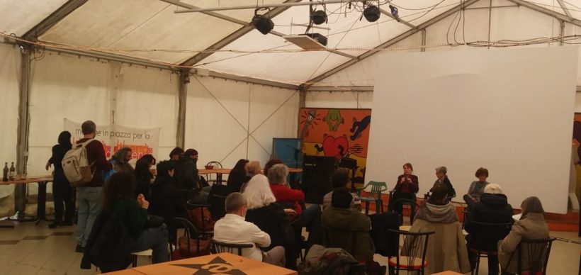 Il buon Andrea, che spesso abbiamo incontrato in valle, e Daniela, della nostra redazione, introducono l’incontro: prima di tutto un importante collegamento con Roberto che da Bussoleno racconta come stanno in valle. Descrive il botta e risposta continuo tra il movimento e le cosiddette forze dell’ordine, i cantieri aperti, recintati, difesi con grande dispiego di forze e l’assenza di lavori. Gli incendi che avvengono nella notte alle semplici strutture imbastite dai No Tav, ma soprattutto la coscienza che il Covid e ora la guerra hanno fatto emergere ancora di più quali siano gli interessi, le volontà di silenziare il dissenso, di militarizzare. In valle ci sono abituati, resistono.