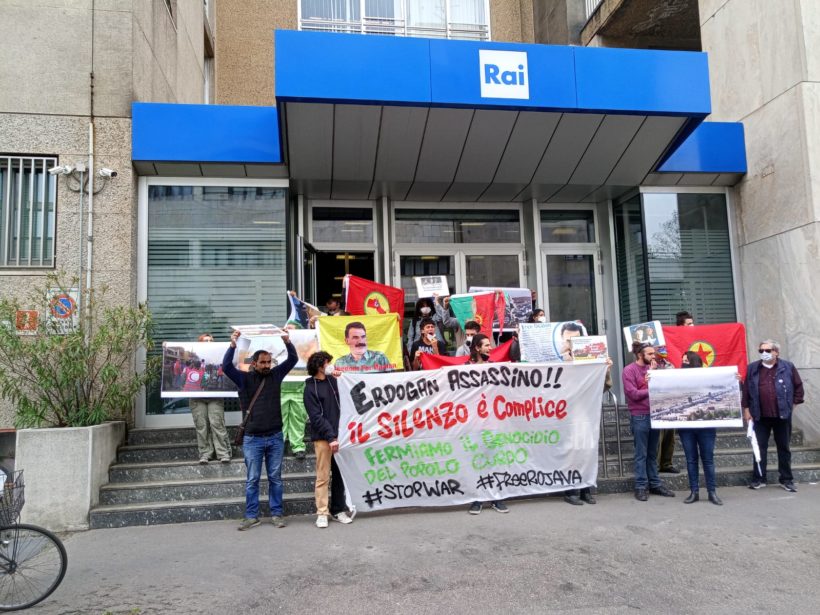 Più composto il presidio in Piazza Fontana, più movimentato e rumoroso quello davanti alla sede della RAI, dove per un certo tempo si è stati dentro l’atrio gridando a gran voce la vergogna del silenzio dei mezzi di informazione sul sangue versato dal popolo curdo.