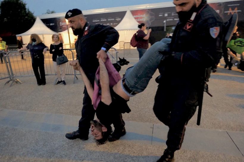 Si conclude così una settimana intensa di azioni di disobbedienza civile nonviolenta da parte di Extinction Rebellion, in quella che gli attivisti hanno chiamato EuroRebellion. Domenica 9 maggio, tre attivisti hanno invaso il Turquoise Carpet durante il gala di inaugurazione, interrompendo l’intervista di Blanco e Mahmood. Mercoledì 11 maggio, altri attivisti travestiti da Maneskin si sono incatenati di fronte all’ingresso dell’Eurovillage, al Parco del Valentino. Ogni giorno, tantissimi aereoplanini di carta sono stati lanciati sui palchi durante i concerti, per chiedere agli artisti di parlare di crisi ecoclimatica. Roy Paci, Davide Shorty e The Sweet Life Society hanno raccolto l’appello lanciato da Extinction Rebellion, parlando – dal palco durante i loro concerti – della crisi in atto e ringraziando tutti gli attivisti. Per poi arrivare a ieri sera, con il blocco stradale, il blocco degli ingressi e l’identificazione di massa.