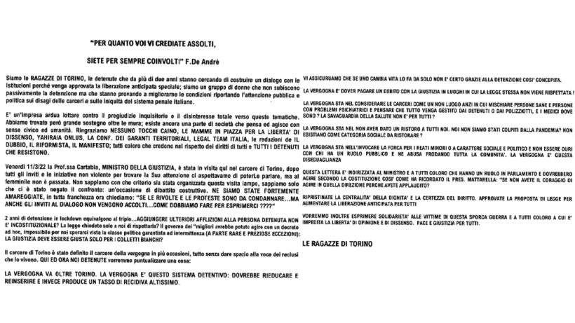 Le donne detenute denunciano che stanno continuando a portare avanti una lotta nonviolenta, la Ministra Cartabia, in visita al Lorusso lo scorso marzo, non ha visitato il blocco femminile, circostanza per la quale si dichiarano fortemente amareggiate.
