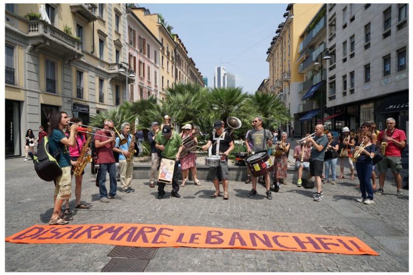 Ma oggi, venerdì 27 maggio alle 12 in punto, una cinquantina di musicisti si sono materializzati in mezzo ai grattacieli di Milano, sotto quell’enorme torre di Unicredit, per dire BASTA agli affari nel mercato delle armi, visto che la banca Unicredit è in cima alle classifiche tra le banche che sostengono il business sugli armamenti: 2 miliardi e 400 milioni di euro, il suo giro di denaro al riguardo, nel solo 2021.