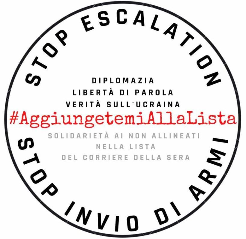 A una settimana dalla pubblicazione della lista nel Corriere della Sera con i nomi dei non-allineati alla propaganda bellica, che lottano per una soluzione diplomatica in Ucraina, la giornalista e fotoreporter Sara Reginella ha invitato, dai suoi canali social, ad esprimere la nostra solidarietà agli intellettuali e giornalisti schedati, con la condivisione dell’hashtag: #AggiungetemiAllaLista
