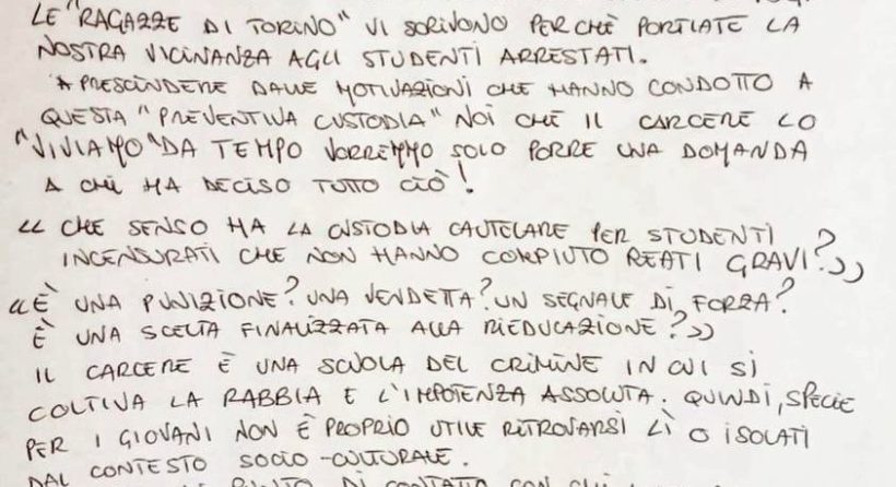 Le “ragazze di Torino” vi scrivono perché portiate la nostra vicinanza agli studenti arrestati. A prescindere dalle motivazioni che hanno condotto a questa “preventiva custodia” noi che il carcere lo “viviamo” da tempo vorremmo solo pore una domanda a chi ha deciso tutto ciò !