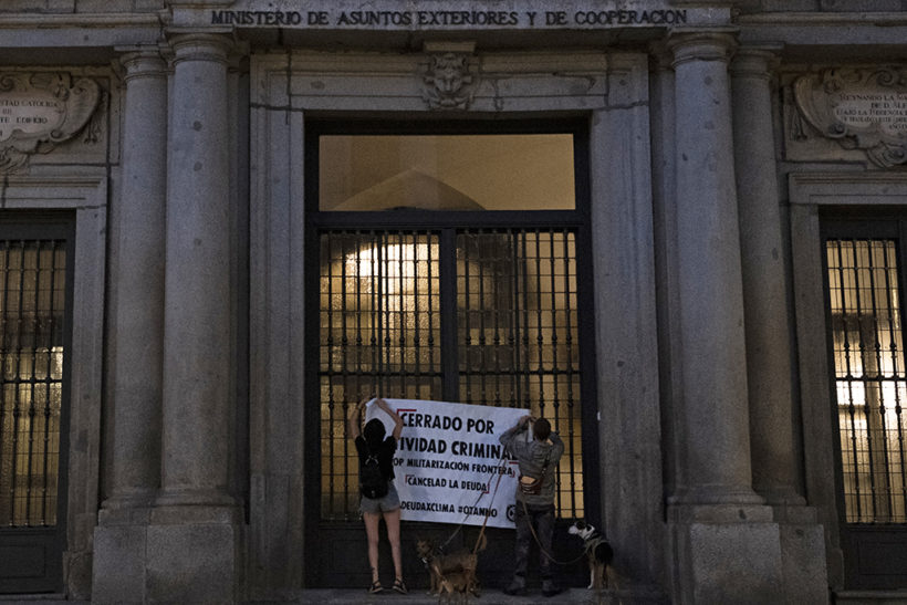 Le porte del Ministero degli Esteri spagnolo sono state bloccate all’alba con catene e uno striscione con la scritta “Chiuso per attività criminali” dal movimento globale contro la crisi climatica Extinction Rebellion. Il blocco è durato pochi minuti, prima di essere rimosso dal personale del ministero.