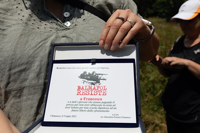 In occasione della commemorazione della battaglia di Balmafol l’ANPI di Bussoleno, Chianocco, Foresto, ha consegnato una targa alla mamma di Francesco, lo studente tutt’ora in carcere per i fatti del 18 febbraio