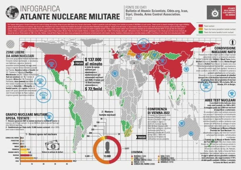 Nell’infografica di copertina potere osservare a colpo d’occhio quanto descritto nell’articolo così come avere ulteriori informazioni a proposito del nucleare militare. I dati sono aggiornati al luglio 2022.