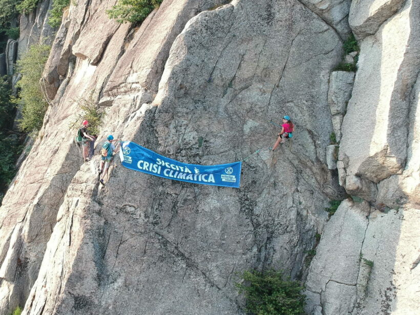 Con l’obiettivo di denunciare la relazione diretta tra la siccità che si sta abbattendo sul nostro paese e la crisi climatica globale che colpisce i nostri ambienti alpini, alcuni attivisti di Extinction Rebellion sono tornati in azione nel territorio montano piemonte. Appesi alle corde per simboleggiare come la nostra sopravvivenza sia davvero appesa ad un filo, quattro attvisti sono saliti lungo una delle vie di arrampicata di Roccia Sbarua ed hanno appeso uno striscione con la scritta “Siccità è crisi climatica“.
