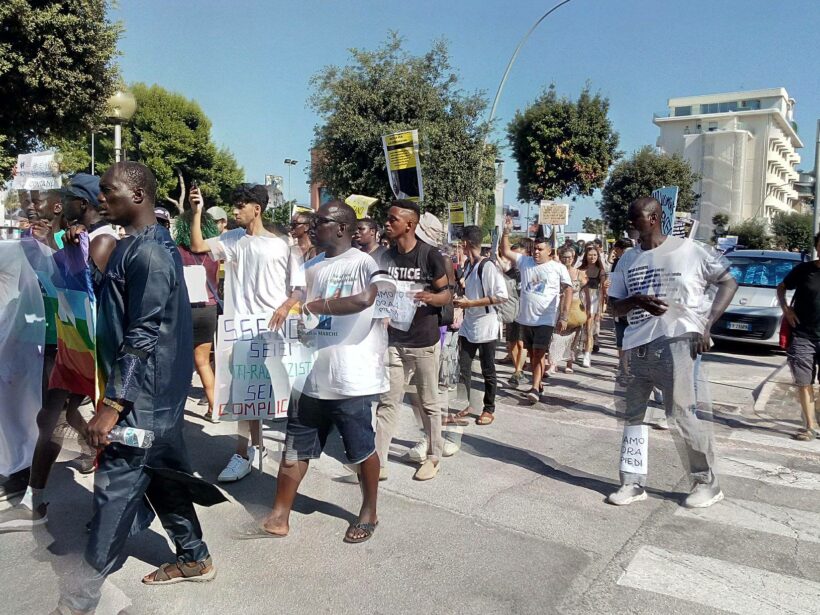 Impegno e generosità che erano presenti ieri a pomeriggio a Civitanova, dove la comunità nigeriana aveva indetto una manifestazione. Purtroppo l’infelicissima scelta dell’orario, le 14 di un caldissimo 6 agosto, con la partenza del corteo alle 14.15 e il concomitante ritardo dei pullman proveniente da fuori ha comportato che in realtà ci fossero due manifestazioni, per la felicità della polizia e dello stesso sindaco leghista che così ha probabilmente evitato una possibile contestazione. Chi scrive è arrivato dopo un’ora che il primo corteo aveva percorso il breve tragitto fino alla piazza centrale di Civitanova. Nel frattempo l’altro folto gruppo fermo al concentramento, espressione delle associazioni provenienti dal Nord Italia, principalmente Torino, Milano, Padova, Bologna, ha dovuto aspettare due pullman milanesi arrivati in notevole ritardo. Nel frattempo in piazza aveva parlato il sindaco; a quanto ci è stato riferito ha fatto un discorso “furbo”, evidentemente per evitare tensioni con un piazza assolata dove spiccava la presenza della comunità nigeriana con le magliette “giustizia per Alika” e un certo numero di compagni provenienti da altre città marchigiane, complessivamente circa trecento presenza. Il secondo corteo di 150 persone ha attraversato la lunga via, con una scarsa presenza di civitanovesi, che ogni tanto comparivano da qualche bar aperto e soprattutto da balconi e finestre, in uno scenario dove, come accadde a Fermo, si percepiva comunque una città assente.