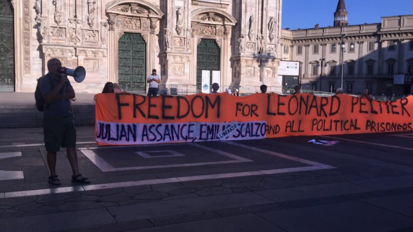 Lunedì 12 settembre, pomeriggio, ultimo sole in piazza Duomo a Milano. Si stende il lungo striscione un’ennesima volta, almeno una ventina di persone a sorreggerlo, a volantinare, a gridare la storia di Leonard, nel giorno del suo 78esimo compleanno. Silvia Zaru, con la sua meravigliosa voce, canta e coinvolge chi si avvicina nella piazza. Il poliedrico artista Filippo Borrella è sui trampoli e lancia un appello: “Se troviamo un bel muro a Milano, facciamo un grande murales per Peltier!” Troviamolo…