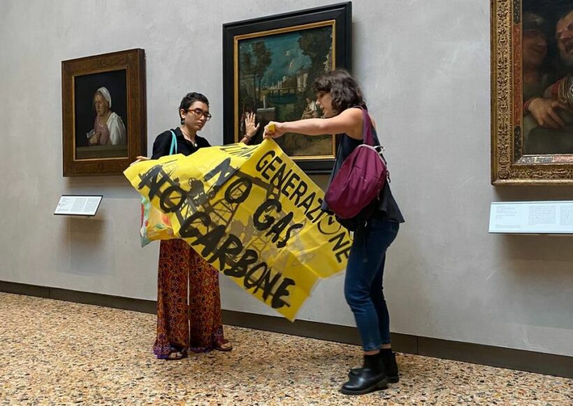 Questa mattina alle 11:30 nelle Gallerie dell’Accademia di Venezia due giovani del movimento Ultima generazione hanno manifestato la loro richiesta di agire, con urgenza, per fermare il disastro climatico incollando le proprie mani alla cornice del dipinto cinquecentesco “La Tempesta” del Giorgione.