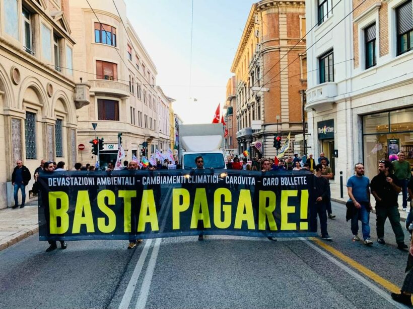 Il 23 settembre lo striscione di apertura, “Noi sporchi di fango voi sporchi di sangue”, era stato inevitabilmente incentrato sulla stretta attualità, sul vergognoso ritardo dei soccorsi, sulle tredici vittime (una, la signora Brunella Chiu, è ancora dispersa) a fronte della generosità e della solidarietà con cui centinaia di volontari, in prevalenza giovani, che sin dalle prime ore si erano adoperati per soccorrere le popolazioni colpite, impegno andato avanti per due settimane, tramite il coordinamento nato grazie a Spazio Autogestito Arvultura, diventato il punto di riferimento, Brigate di Solidarietà attiva, Brigate per l’emergenza e Potere al Popolo. Questa volta sulla spinta delle tante proteste nate in tutta Italia sul caro bollette e più in generale contro l’insostenibile e insopportabile carovita, temi ambientali e questione sociale hanno trovato un’efficace sintesi nella parola d’ordine: “Basta pagare”.
