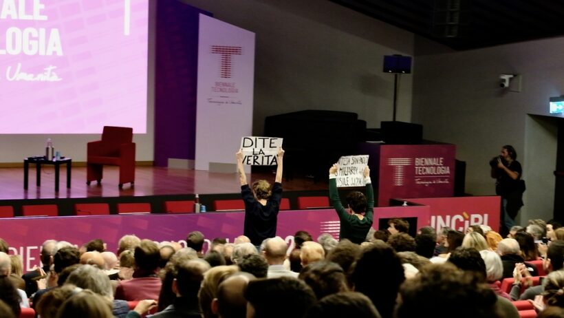 “Non sarò così ingenua da chiedere semplicemente di smettere di accettare i soldi di Intesa San Paolo” ha detto Caterina, leggendo il suo discorso. “Sono qui per chiedere al direttivo della Biennale Tecnologia di ammettere questo paradosso e al rettore Guido Saracco, ai professori e ricercatori di questa università di farsi portavoce di questo messaggio e della gravità di questa crisi”.