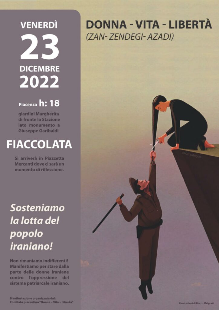 Anche da Piacenza vogliamo far sentire la vicinanza ai manifestanti iraniani in lotta per la libertà. In particolare vogliamo esprimere piena solidarietà a tutte e tutti coloro che, nonostante la dura repressione di questi giorni, continuano a chiedere in Iran il rispetto delle libertà fondamentali, l’uguaglianza, la giustizia sociale e la fine di un sistema dittatoriale e oppressivo. La cruenta uccisione della ventiduenne Mahsa (Jina) Amini, curdo-iraniana, da parte della polizia morale (Gasht-e Ershad, la pattuglia della morte) , ha reso visibile a livello internazionale l’oppressione delle donne nel sistema patriarcale iraniano e contemporaneamente ha dimostrato altresì l’impossibilità di poter esprimere le proteste anche da parte della popolazione maschile.