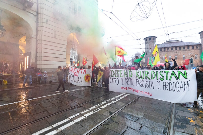 Ieri il corteo partito da piazza Castello ha sfidato la pioggia per sfilare in solidarietà ai Kurdi contro l’attacco armato di Erdogan nel nord della Siria