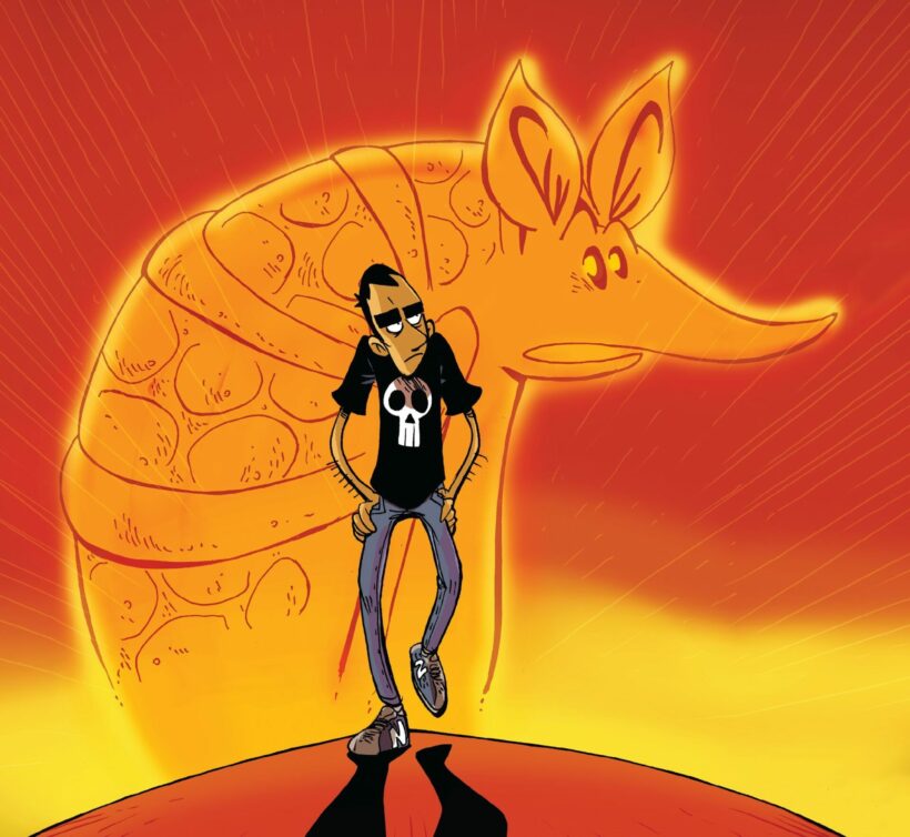 Da una parte le ansietà del Michele-essere umano, presente sempre, anche a costo di lavorare tutta la notte pur di riuscire a contribuire a questa o quella causa con un disegnetto… ma non privo di incertezze, punti deboli, contraddizioni, sensibilissimo alle critiche di chi magari gli è amico dall’infanzia ma non potrà mai capirlo fino in fondo. Il mondo insomma che l’artista riesce a condividere solo con l’Armadillo, personificazione quanto mai geniale del rovello interiore che alberga in tutti noi.