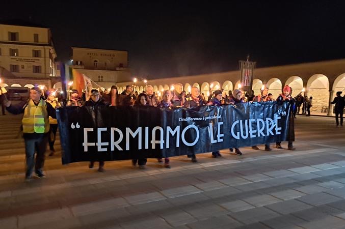“Nella notte simbolo della terza guerra mondiale in cui siamo stati trascinati – spiega Flavio Lotti, organizzatore della Perugia Assisi – vogliamo restare svegli, in piedi, in cammino per andare incontro alle vittime e provare a sentire il loro sentire: il buio, il freddo, l’inedito, l’incertezza, la paura, la stanchezza. Svegli perché non possiamo dormire sonni tranquilli mentre si sta consumando questa tragedia. In piedi perché non c’è altro modo per aprire ‘le porte della notte’ che oggi ci imprigionano. In cammino perché dobbiamo reagire all’immobilismo e alla rassegnazione generale, perché dobbiamo fermare l’escalation, ottenere il ‘cessate-il-fuoco’, scongiurare il disastro totale, perché la pace va ricercata anche quando il buio si sta facendo pesto”.