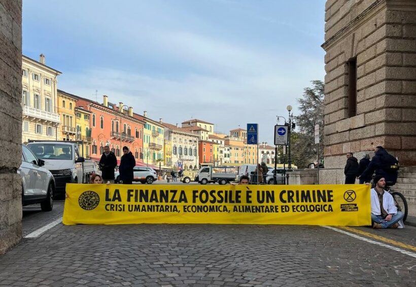 Nella giornata dello sciopero globale per il clima, indetto dai Fridays for Future, questa mattina tra le 10:30 e le 10:45 un gruppo di cittadini e cittadine hanno bloccato il traffico sotto l’orologio di Corso Porta Nuova a Verona esponendo uno striscione con la scritta “La finanza fossile è un crimine. Crisi umanitaria, economica, alimentare ed ecologica”. All’iniziativa, organizzata da Ultima Generazione nell’ambito della campagna NON PAGHIAMO IL FOSSILE, hanno preso parte due persone aderenti a Ultima Generazione, 3 persone aderenti a Extinction Rebellion Verona, 1 persona aderente a Scientist Rebellion e 1 persona aderente a Fridays for Future in supporto.