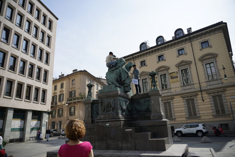 Statue bendate sabato scorso nel centro di Torino da attivisti di Extinction Rebellion, Fridays For Future, GreenTo e alcune consigliere di Sinistra Ecologista