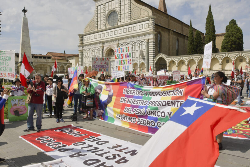 Una coloratissima manifestazione delle varie comunità peruviane presenti in Italia ha attraversato questo pomeriggio il centro storico di Firenze da piazza Santa Maria Novella a piazza SS Annunziata, denunciando il governo golpista di Dina Boluarte che ha sequestrato il legittimo Presidente Pedro Castillo.