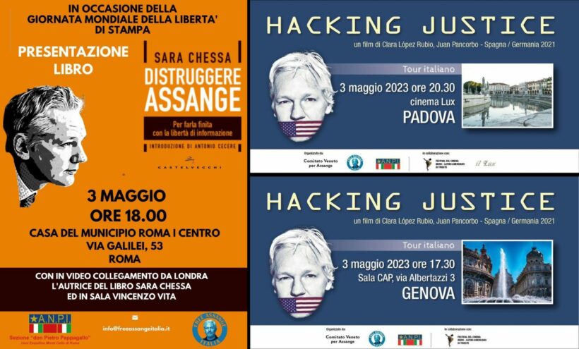 A Genova, invece, l’ANPI e Free Assange Italia offriranno il film su Assange Hacking Justice, dei registi spagnoli Clara Lopez Rubio e Juan Pacorbo (con sottotitoli italiani). La proiezione si terrà il 3 maggio alle ore 17.30 presso la Sala CAP, Via Ariberto Albertazzi, 3r, con una breve introduzione di Massimo Bisca, Presidente dell’Anpi Genova. L’evento è stato reso possibile grazie alla collaborazione di Monica Nepi, Donatella Mardollo e Marianella Diaz di Free Assange Italia e del Festival del Cinema Ibero-Latino-Americano di Trieste: https://www.facebook.com/events/1590485715106048/ .