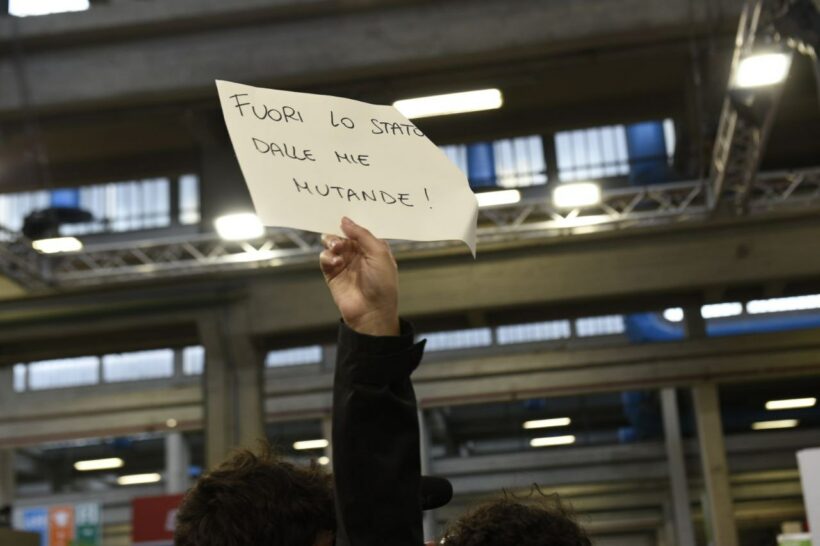 Interrotto l’intervento della Ministra per la famiglia, Eugenia Roccella, nel padiglione della Regione Piemonte, da parte di diversi movimenti di Torino, da Extinction Rebellion a Non Una di Meno