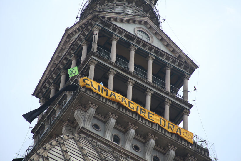 Un gruppo di attivisti ha pagato il biglietto ed ha raggiunto la Cuspide della Mole Antonelliana, srotolando uno striscione giallo di 12 metri “Clima: Agire Ora”, ben visibile da via Montebello. Ai lati sono stati aggiunti due drappi neri di 6m l’uno.