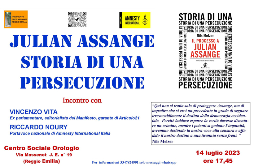 Venerdi 14 luglio alle 17.45 al Centro sociale Orologio di V. Massenet si terrà la presentazione del libro “Il processo a Julian Assange Storia di una persecuzione”, iniziativa organizzata dal Movimento Free Assange Reggio Emilia in collaborazione con Amnesty International Italia.