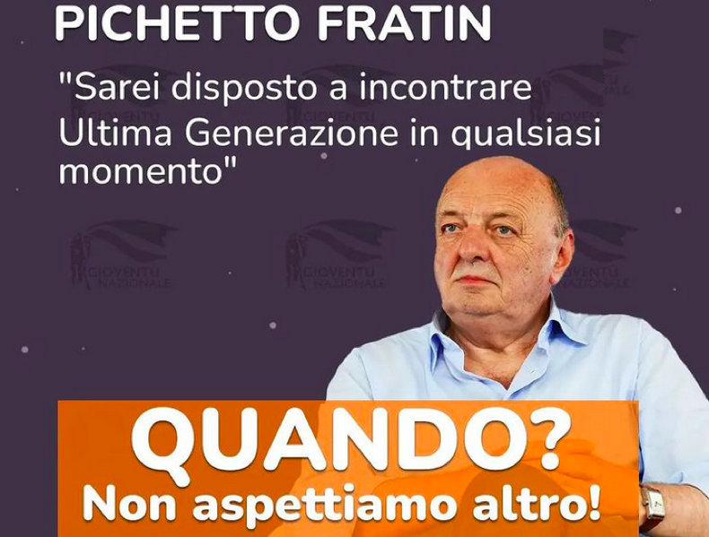 Lo scorso 30 giugno, nel corso di un’intervista, il ministro dell’Ambiente Pichetto Fratin si è detto disponibile a incontrare rappresentanti di Ultima Generazione per parlare di ambiente.