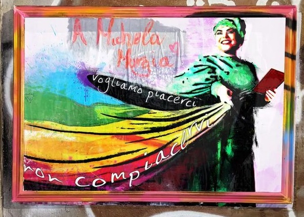 Il murale di Donati Meyer rappresenta Michela Murgia fasciata in un abito verde con un enorme strascico arcobaleno, su cui è incisa la frase che molto rappresenta delle sue idee: “Vogliamo piacerci non compiacervi”. È un sunto grafico del pensiero della scrittrice, sulla scena pubblica dal momento della malattia anche per rivendicare la dignità della sua famiglia queer, composta da persone con legami affettivi e non di sangue. Prima di morire, Murgia aveva sposato Lorenzo Terenzi: una scelta politica fatta per tutelare e permettere a qualcuno di fiducia di curarsi dell’eredità della scrittrice.