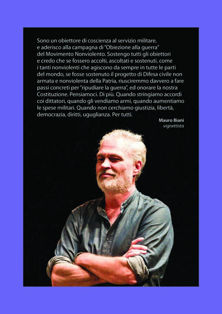 Sono un obiettore di coscienza al servizio militare, e aderisco alla campagna di “Obiezione alla guerra” del Movimento Nonviolento. Sostengo tutti gli obiettori e credo che se fossero accolti, ascoltati e sostenuti, come i tanti nonviolenti che agiscono da sempre in tutte le parti del mondo, se fosse sostenuto il progetto di Difesa civile non armata e nonviolenta della Patria, riusciremmo davvero a fare passi concreti per “ripudiare la guerra”, ed onorare la nostra Costituzione. Pensiamoci. Di più. Quando stringiamo accordi coi dittatori, quando gli vendiamo armi, quando aumentiamo le spese militari. Quando non cerchiamo giustizia, libertà, democrazia, diritti, uguglianza. Per tutti.