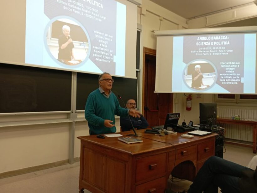 Una piccola folla di amici, colleghi, ex allievi, attivisti ha ricordato Angelo Baracca nelle aule dove ha insegnato per tanti anni presso l’Istituto di Fisica di Arcetri; l’iniziativa, durante tutta la giornata del 24 Ottobre, ospitata dall’Istituto stesso, era promossa da SIFS – Società Italiana di Fisica Statistica, SISFA – Società Italiana di Storia della Fisica e dell’Astronomia, Multimage, Pressenza, Peacelink in una interessante e importante sinergia tra il mondo accademico e quello dell’associazionismo.
