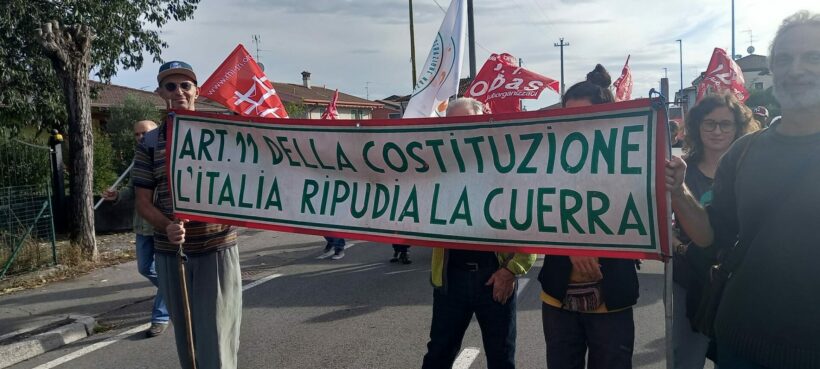 Sono arrivati in bus organizzati da Milano, Genova, Bologna, Torino e da Perugia, Roma, Viterbo, persino da Napoli. Tantissime le bandiere SiCobas che insieme a quelle palestinesi hanno inondato di rosso, bianco, nero e verde la piazza del Comune di Ghedi fin dal primo pomeriggio di ieri, 21 ottobre. Si sono poi messi in marcia verso l’aeroporto militare, in un corteo che ha visto sfilare insieme ai SiCobas, varie organizzazioni locali, i giovani della FGC e dei CARC e tantissimi pacifisti, più che mai in allarme circa la preoccupante presenza in territorio italiano di armi nucleari tre volte più potenti e distruttive di quelle che vennero sganciate su Hiroshima e Nagasaki.