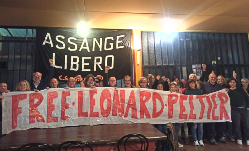 E così in questo caloroso spazio mi hanno invitato a raccontare, ancora una volta, di Leonard Peltier. Decine di persone attente, fino a tarda ora. Poi una foto con lo striscione che si somma al loro, dedicato a Julian Assange. Due storie simili: lo strapotere del governo Usa.