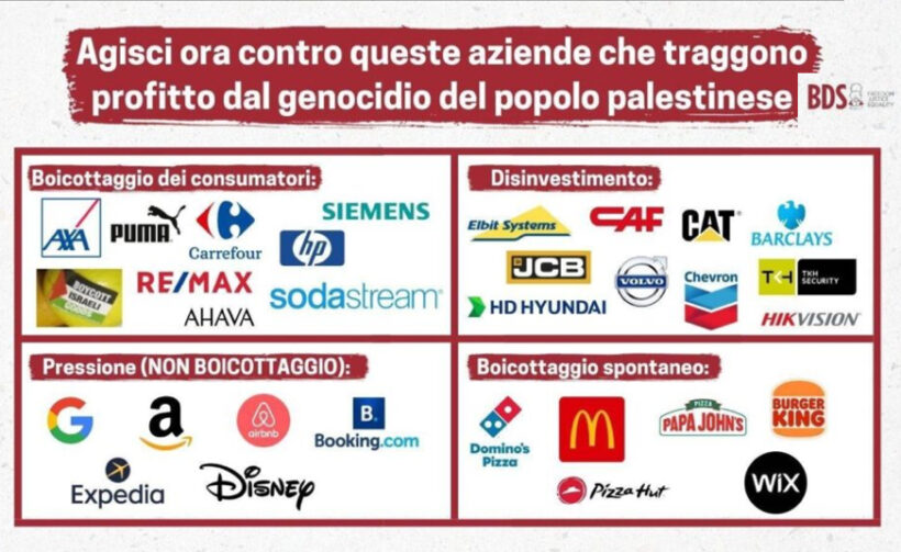 Dal 7 ottobre, a seguito dell’assedio totale su Gaza, trasformata in un “cimitero per migliaia di bambini”come riporta Unicef, le campagne di boicottaggio e disinvestimento sono sentite più urgenti che mai e il BDS ha stilato una lista di prodotti e aziende da boicottare che svolgono un ruolo attivo nel supportare Israele e le gravissime violazioni dei diritti dei palestinesi.