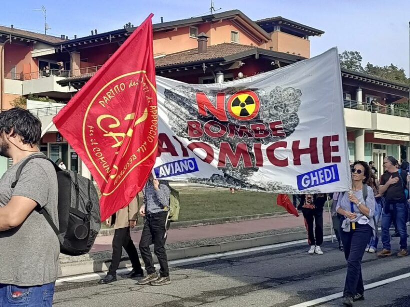 “E’ dal 2016 che stiamo lavorando a questo coordinamento a livello lombardo, figurati se possiamo arrenderci proprio adesso” mi fa notare l’attivista Beppe Corioni del Centro Sociale 28 maggio. “Proprio adesso che con la manifestazione del 21 ottobre scorso siamo riusciti a rivedere in marcia intorno alla Base di Ghedi una marea di gente, non meno di 5000 manifestanti di ogni nazionalità e colore della pelle grazie all’organizzazione condivisa con i SiCobas: una partecipazione persino maggiore di quella che nel 2017 vide arrivare compagni da tutt’Italia, c’era persino Zanotelli… E non ci siamo limitati alle manifestazioni! In tutti questi anni abbiamo promosso convegni di studi, particolarmente importante quello del febbraio scorso presso i missionari comboniani di Venegono, dal titolo “Il Futuro è Nato?” (ndr: ne abbiamo riferito qui). E ben consapevoli dell’importanza della nostra campagna, ci siamo rivolti a IALANA, autorevole associazione di giuristi specializzati in Diritto Internazionale oltre che in materia di armi nucleari. Per rendere massimamente fruibili i risultati di questa campagna, che senz’altro non riguarda solo il nostro territorio perché sappiamo quante basi militari ci sono in Italia, abbiamo pubblicato un libro dal titolo Parere giuridico sulla presenza delle armi nucleari in Italia, Ed Multimage – sulla base del quale si è poi sviluppata la denuncia alla Procura della Repubblica di un mesetto fa…”