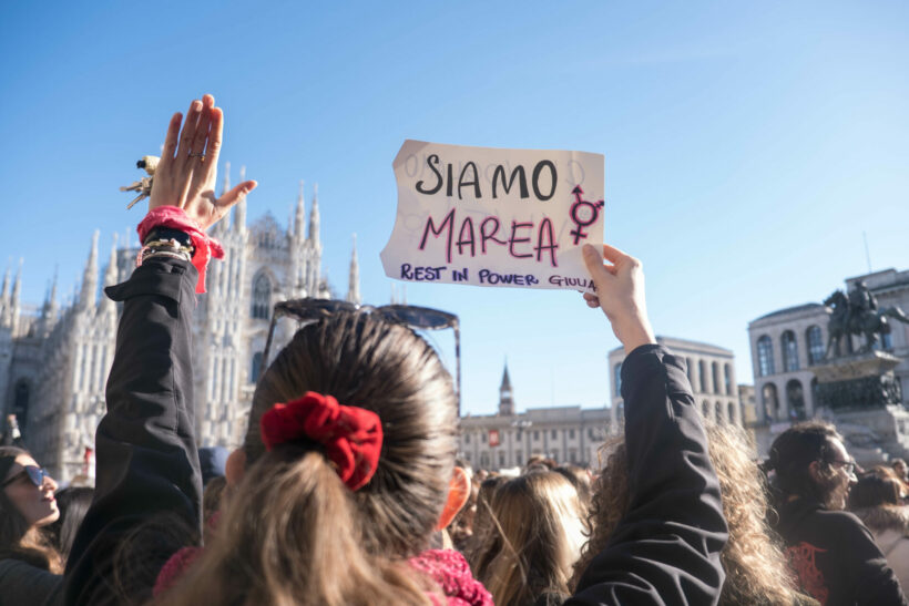 Al mio arrivo in Largo Cairoli trovo una moltitudine composta. Ci sono donne adulte, ragazze, bambine, ma anche tanti uomini adulti, ragazzi, bambini, c’è attenzione alla voce che scandisce il nome delle oltre 100 donne e ragazze uccise dall’inizio dell’anno e aggiunge il modo e il luogo in cui sono morte.